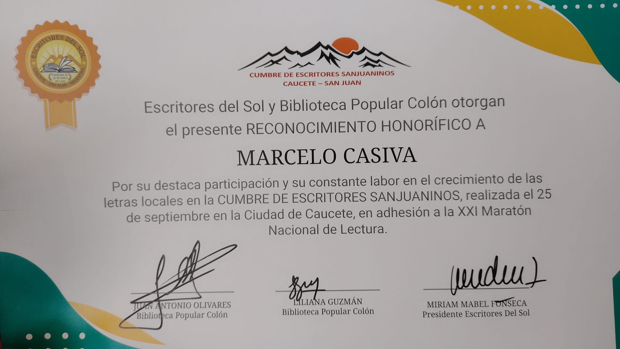 El grupo literario “Escritores del Sol”, del departamento Caucete, me brindó un cálido reconocimiento que significó mucho para mí como autor. Este grupo, comprometido con promover la palabra escrita, me incluyó entre los escritores destacados, lo cual inspira mi compromiso con la literatura.